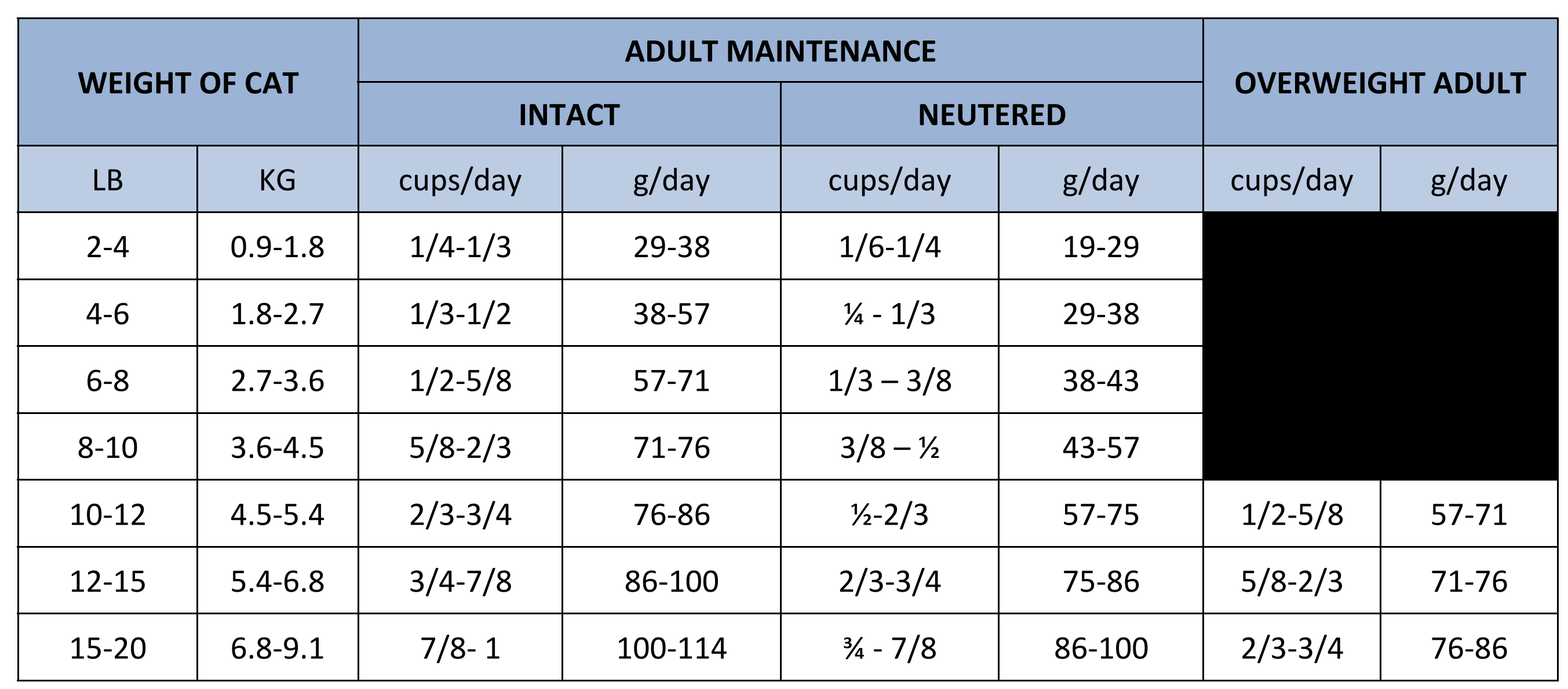 3800 kcal/kg (433 kcal por cada 250ml/taza de 114 g), con unas calorías bien distribuidas para mantener unas condiciones óptimas; un 37% de proteínas, un 27% de hidratos de carbono y un 36% de grasas.