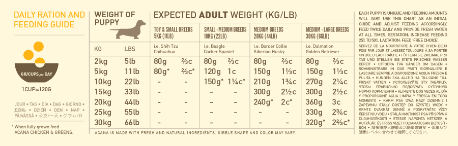 La energía metabolizable es de 3660 kcal/kg (439 kcal por taza de 250 ml/120 g), con un 32 % de proteínas, un 22 % de carbohidratos y un 46 % de grasas. ACANA Puppy & Junior está formulado para cumplir con los niveles nutricionales establecidos por la FEDIAF para cachorros, excepto para cachorros de Gran Danés en crecimiento antes de las 14 semanas.