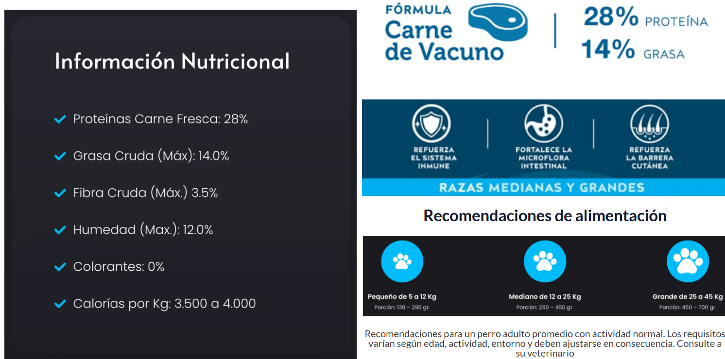 Carne fresca de vacuno deshuesada, Hígado fresco de vacuno, harina de carne de bovino, maíz, subproductos de trigo, proteína aislada de soya, levadura de cerveza, aceite mixto, hidrolizado de hígado de vacuno, premix vitaminas (A,D,E,B1,B6,B12, Cloruro de Colina, Niacina, Ácido Fólico, Biotina) minerales (Calcio, Fósforo, Hierro, Magnesio, Yodo, Selenio, Colbato, Cobre, Zinc), bioquina plus, Omega 3 y 6, extracto de yuca (control de olores).