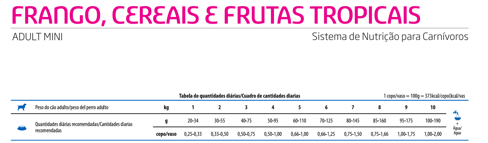 Pollo (carne mecánicamente separada de pollo, harina de vísceras de pollo – mín. 20%), cereales y frutas (avena, granos de sorgo, cebada em granos, plátano deshidratado, papaya deshidratada, kiwi deshidratado, mango deshidratado – mín. 35%), harina de chicharrón (piel de cerdo), harina de pescado, huevo en polvo, aceite de pollo, aceite de pescado, sub-producto de arroz, sub-producto de trigo, pulpa de remolacha, levadura seca de cervecería (Saccharomyces cerevisiae), zanahoria deshidratada, aditivos prebióticos (FOS y MOS), DL-metionina, taurina, L-carnitina, sulfato de condroitina, sulfato de glucosamina, aditivos adsorbentes (extracto de yuca (Manihot esculenta) y zeolita), hidrolizado de hígado de aves y cerdos, vitaminas (A, D3, E, B1, B2, B5, B6, B12, C, biotina, niacina, ácido fólico, cloruro de colina), cloruro de sodio, cloruro de potasio, hierro aminoácido quelato, cobre aminoácido quelato, zinc aminoácido quelato, manganeso aminoácido quelato, proteinato de selenio, yodato de calcio, propionato de calcio, concentrado de tocoferoles.