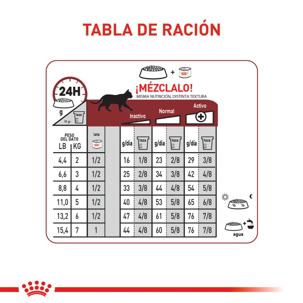 Seguir la tabla de ración indicada en el envase, ajustando la cantidad según peso, edad y nivel de actividad del gato.
